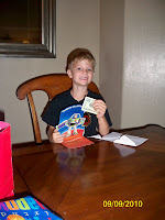 Yesterday was Brayden's 3rd Birthday! We had a busy day running errands and preparing for his party that night. We invited our family over for cake and ice cream. He had an Orange party... he is obsessed with the color orange right now. It is the ONLY color he knows. Every time I asked him about his party, all he would say is orange. What kind of cake? Orange. What kind of ice cream? Orange. What... toys do you want? Orange. So we put orange and blue and white streamers up and orange and blue balloons. I dyed white frosting orange, (we did regular ice cream), had Doritos and cheddar Ruffles and orange (and other) soda. We wandered around the toys looking for orange things. (Besides with 3 older boys, we have already bought SO many of the boy toys.) I bought him a big orange ball, an orange noisemaker, orange bubbles, a coloring book and a Toy Story tricycle. His cousins brought him some fun toys and his grandparents sent cards with money! He was very happy!